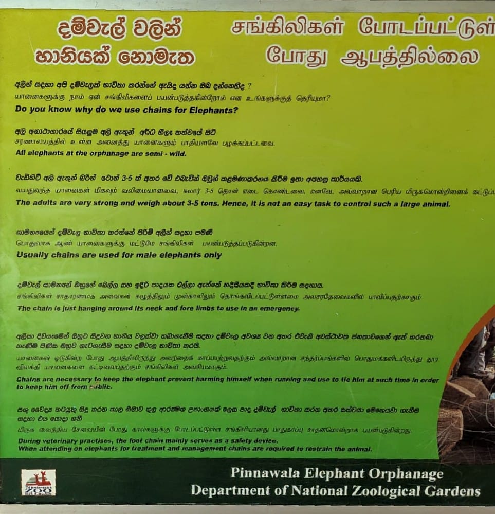 Back inside the orphanage, I was hoping to learn something. There were several informative posters about elephants and Pinnawala. One in particular caught my attention. The title was only in Sinhala and Tamil (local languages), but the text below was available in all three languages (English included).